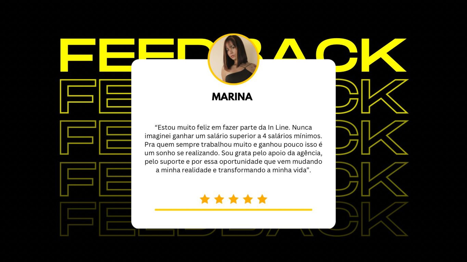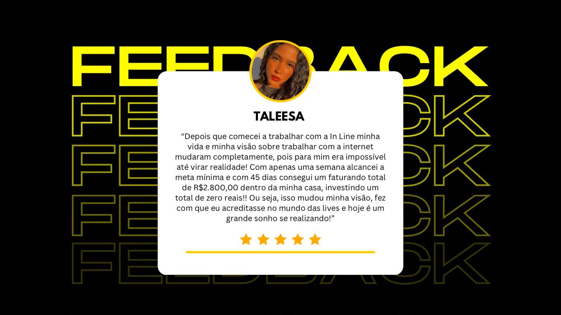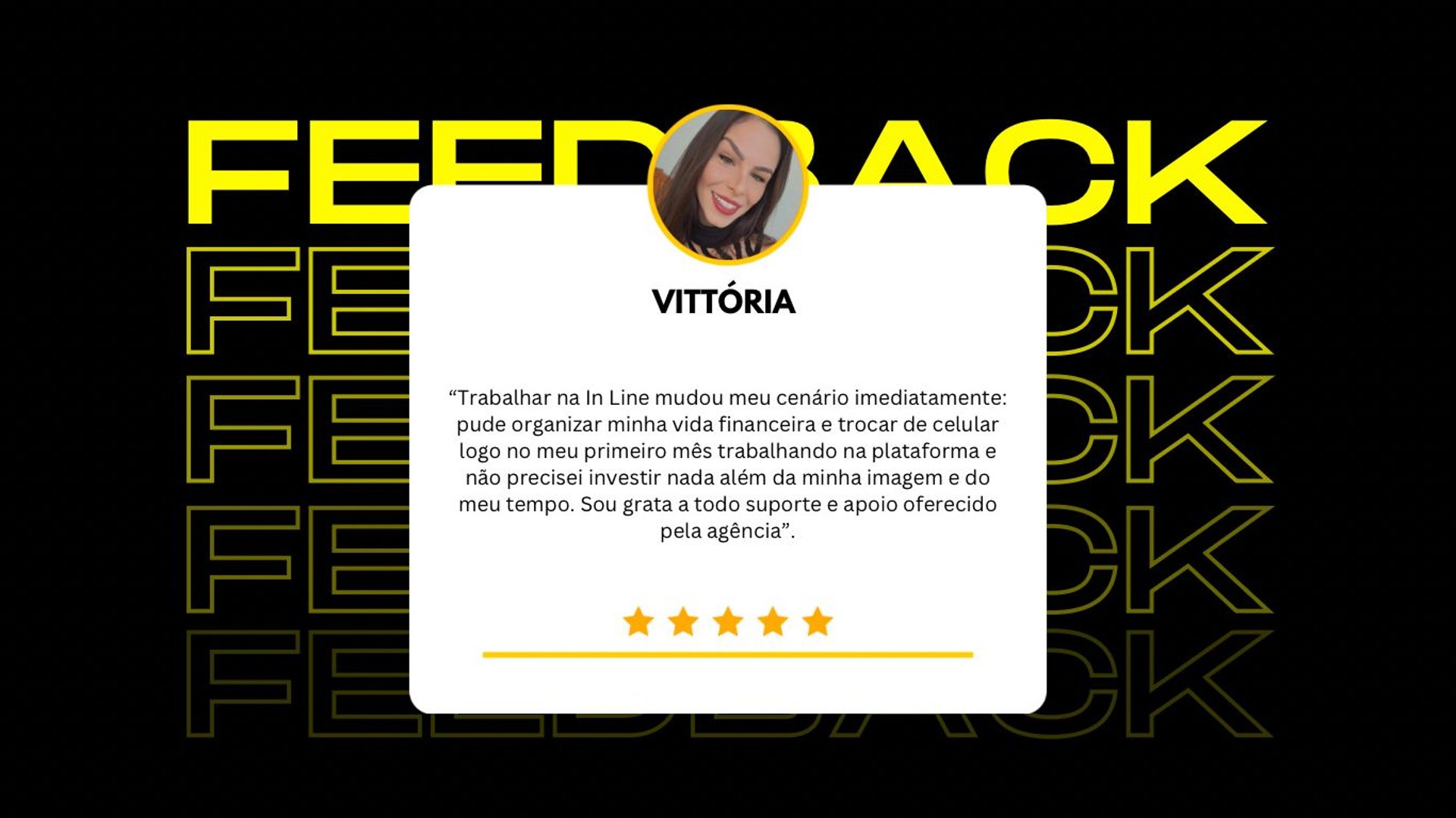 Com a In Line você tem a chance de ganhar milhares de dólares em um único mês sem precisar fazer nenhum tipo de investimento financeiro, trabalhando do conforto da sua casa ou de onde quiser e em qualquer hora do dia utilizando apenas o celular. A nossa agência oferece treinamento + e-book completo de forma 100% gratuita para que você inicie no mundo das lives obtendo resultados logo no primeiro mês. Além disso, somos uma empresa que investe no time: temos premiações internas e oferecemos acesso a curso de inglês durante toda a vigência do seu contrato conosco.